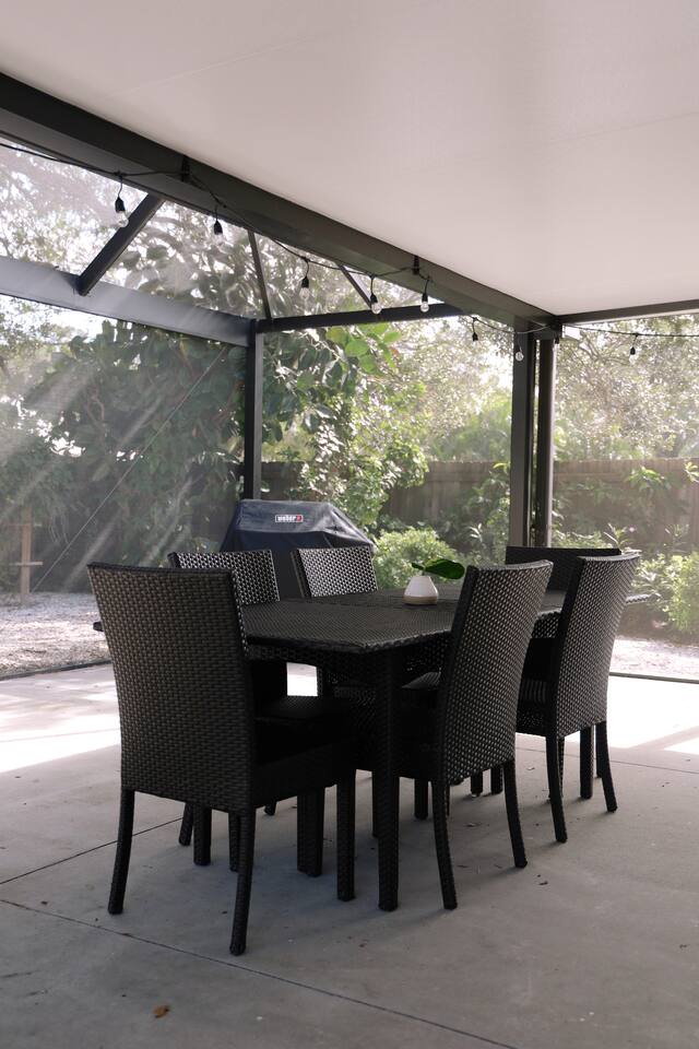Our home is a cozy, comfortable layout offering three bedrooms, two bathrooms, a laundry area, a kitchen, sitting area with space to do yoga and an eating area outside in the lanai. The master bedroom has a private bathroom, and the second bathroom is shared. The outdoor area has a grill and is the perfect place to enjoy a fun barbeque gathering with friends and family. We hope you feel comfortable and cozy at our family’s own getaway! Siesta Key Beach is 3 miles away and Lido Key Beach is 9.8 miles away.